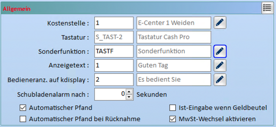 Um diese Sonderfunktion zu aktivieren, gehen Sie in Connect ERP zu Stammdaten > Filiale > Kassen-Einstellungen > Theken. Dort finden Sie in der Registerkarte Allgemein den Bereich Sonderfunktion. Klicken Sie auf das Bearbeiten-Icon, um die Funktion zu aktivieren.