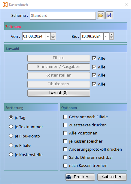 Das Kassenbuch muss mit den folgenden Einstellungen ausgedruckt werden: