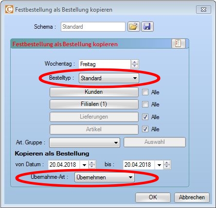 • Überprüfen Sie, ob die richtigen Kunden oder Filialen ausgewählt sind. Die Festbestellung wird nur für die angegebenen Kunden oder Filialen übernommen.